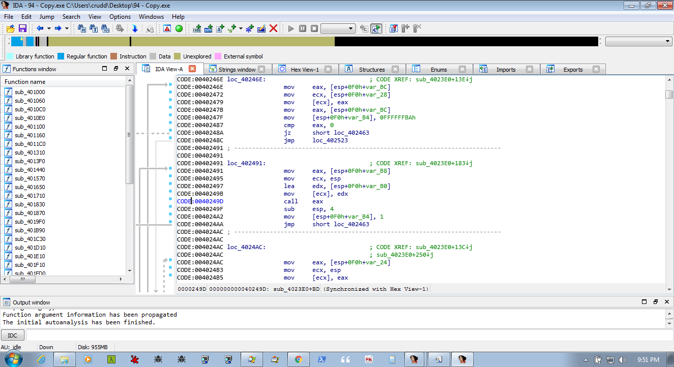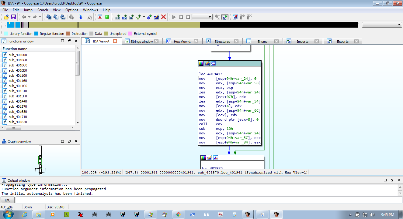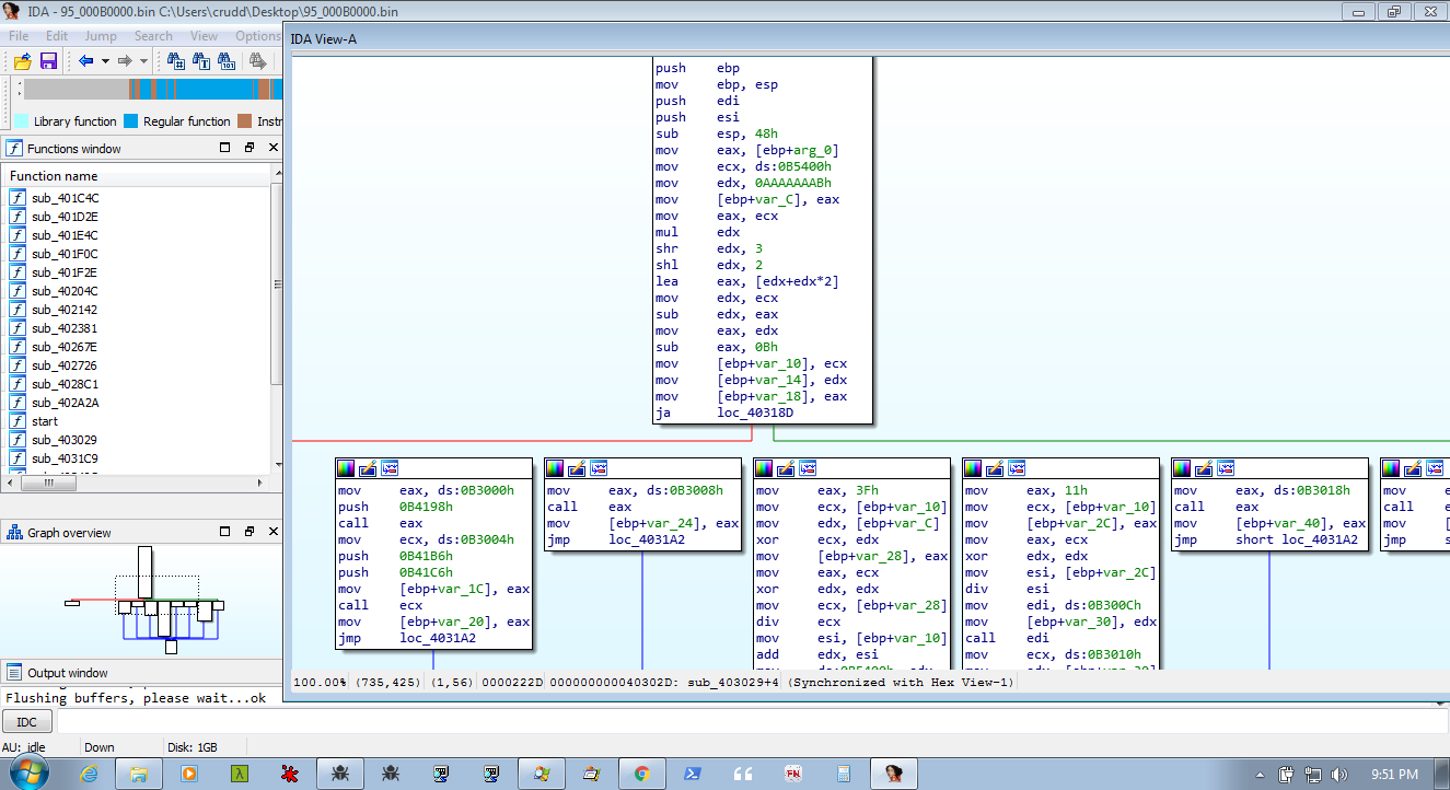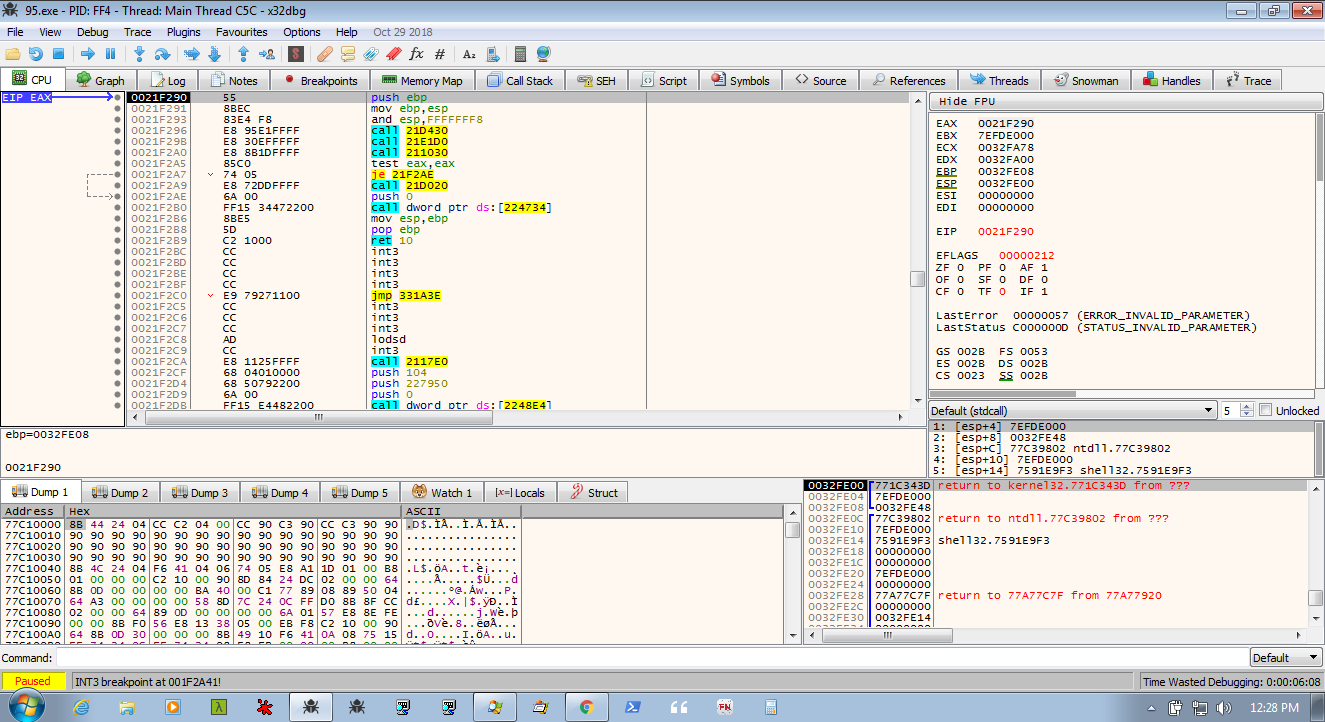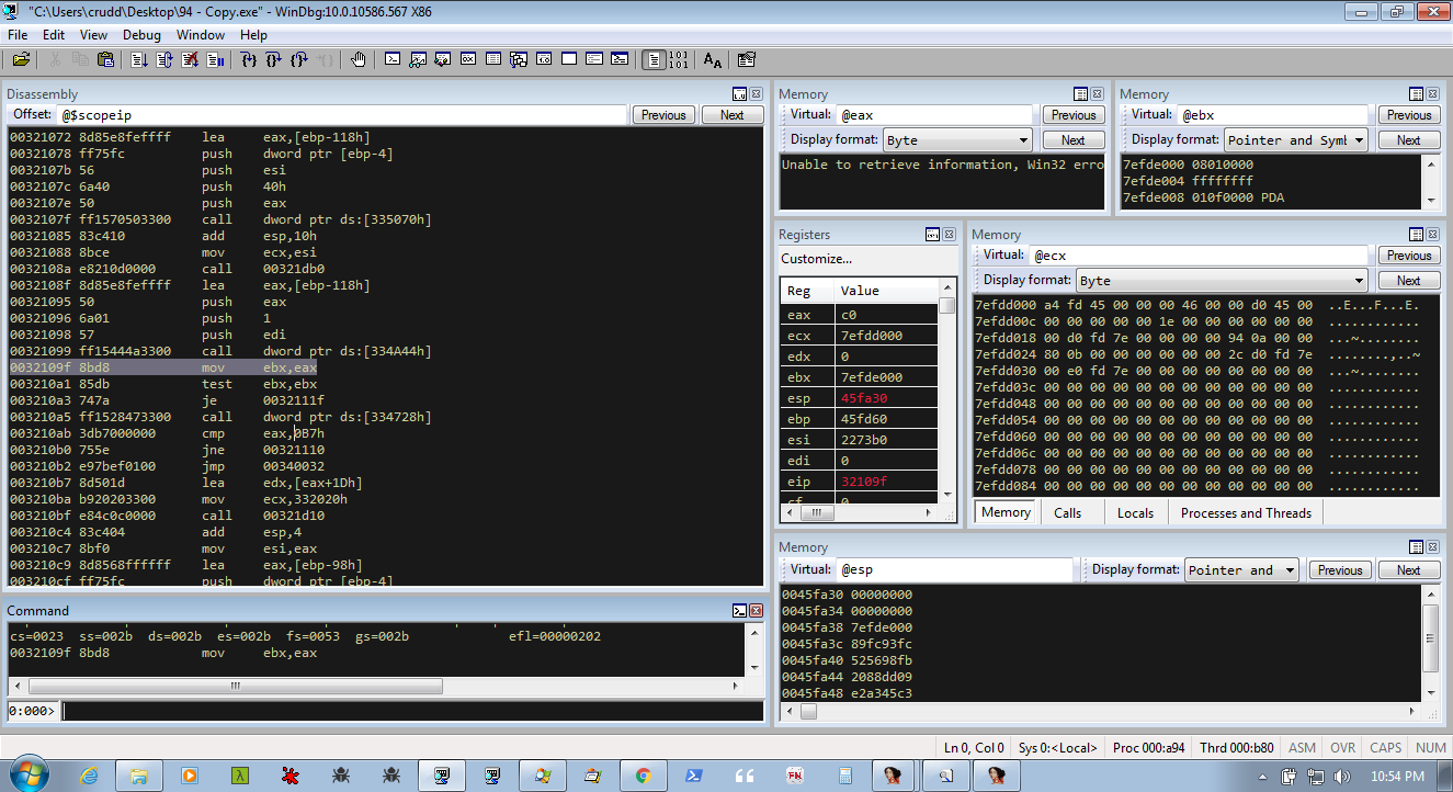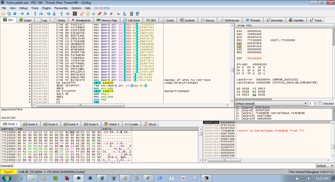 Many VM resets were initiated during this study of Emotet. Stepping over the wrong function or breakpointing on the wrong API(s) can lead to a quick infection, so the VM snapshots will come in very handy. Snapshot often (or maybe give this a try: https://twitter.com/mayahustle/status/1065351756345995264>). The file also deletes itself, so you may want to make a backup.