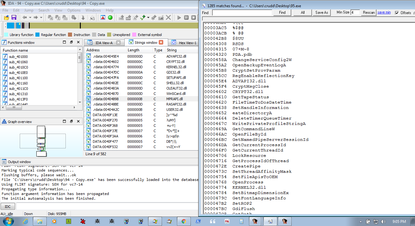 First, we will do some initial analysis. There are various tools and methods to do this. I usually fire it up in IDA and load it up in my favorite PE viewer/hexeditor of the day. For a lot of malware, running strings and/or scanning with a hex editor aren't very useful. This time we can see a bunch of WinApis (some of which look interesting), a few uninteresting or normal looking Windows strings, and a bunch of 4 char meaningless gibberish.